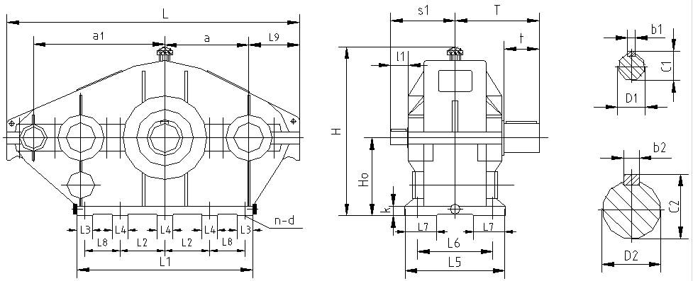 規(guī) 格 | 中心尺寸 | 輪 廓 尺 寸 | 地 腳 螺 栓 | 高 速 軸 伸 | 低 速 軸 伸 | 質(zhì)量 (kg) |
