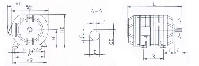 YG系列電動(dòng)機(jī)安裝尺寸符合IEC標(biāo)準(zhǔn),外殼防護(hù)等級(jí)為IP54,冷卻方式為IC0041,額定電壓380V,額定功率為50Hz,H級(jí)絕緣、定子繞組采用Y接法。
