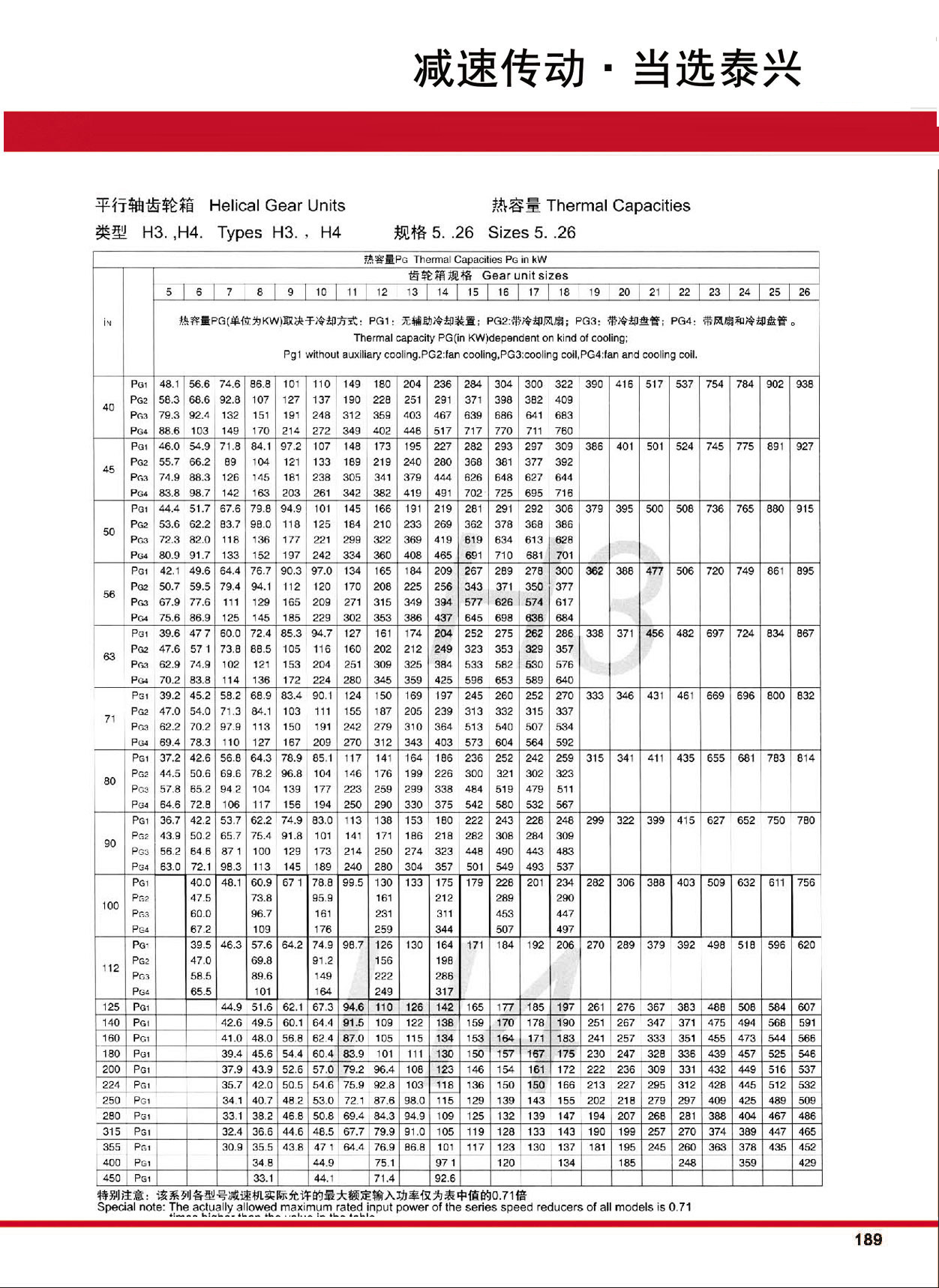 7、 H、B系列產(chǎn)品有3~26型規(guī)格,減速傳動級數(shù)有1~4級,速比1.25~450。