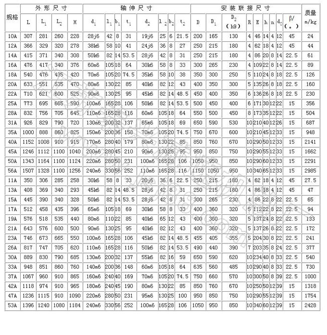 工作條件:輸入轉(zhuǎn)速28B型以下≤3000 r/min,40B型以下≤1800r/min,45B型以下≤1000r/min,Y型≤1500r/min;公稱(chēng)轉(zhuǎn)矩2.107~588kN·m;傳遞功率0.25~2000kW;工作環(huán)境溫度為-40~45℃,低于0℃時(shí),啟動(dòng)前潤(rùn)滑油應(yīng)預(yù)熱,高于45℃時(shí)應(yīng)采取降溫措施。